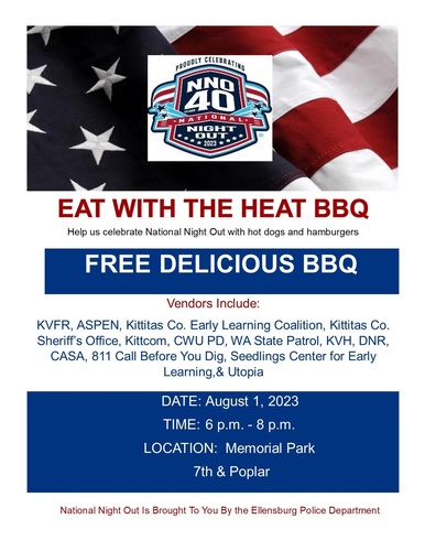 Join the Ellensburg Police Department (EPD) for a free BBQ from 6-8 p.m. August 1 at Veteran's Memorial Park on 7th Avenue and Poplar Street. Help the Ellensburg Police Department and partner public safety agencies celebrate National Night Out with free hot dogs and hamburgers.